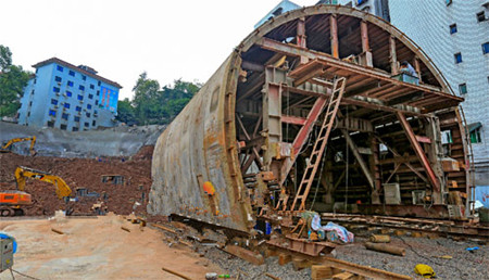 昨(14)日,记者从泸州忠山隧道建设单位项目部获悉,忠山隧道建设工程已进入换向掘洞,改由白招牌广场方向往沱江二桥方向挖掘,解决左洞最后16米和右洞最后47米的挖掘距离。