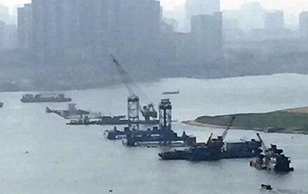 从西岸望去,红谷隧道沉管沉放作业现场一派忙碌景象,首批6节沉管中的最后一节(黑线圈所示)仍漂浮在赣江江面上,月底将沉放到位。