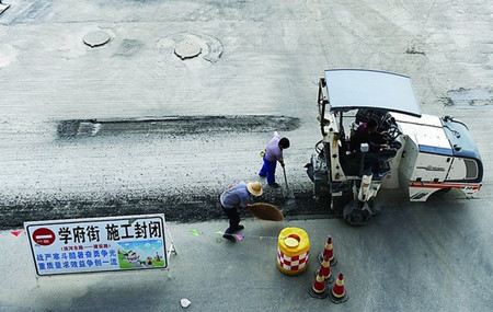 “如果路基符合标准,用轧路机压过去,应该比较平整,现在的路基,压过去之后路面呈波浪形,根本不行。”现场工人介绍。要解决路基问题,需要用砂、片石对路面下进行全面填充。现在施工人员正在清理道路两侧的原有土基,准备进行填充。为了保障施工场地内的交通,路面中间部分尚未开始动工。施工期间,洒水车不停地来回向场地内洒水,以减少扬尘对附近居民及路人造成的影响。