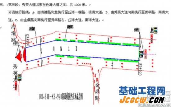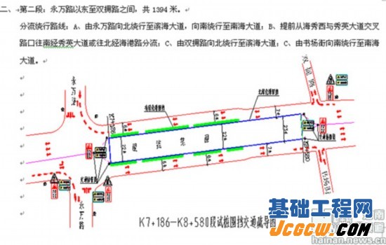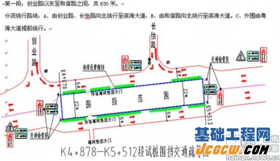 分段桩基施工范围为:从海秀路丘海立交以西、创业路以东约4.5公里分三个工程段进行围挡施工,第一段:创业路至长怡路路段;第二段:永万东路以东约600米路段至双拥路以西约785米路段;第三段:秀英大道至丘海大道立交路段。施工期间原双向六车道将调整为双向四车道,即将原非机动车道、部分人行道改造为机动车道。交通采用车辆分流方式,将东西向部分车流分流至南海大道和滨海大道,部分公交车辆将改变运行线路(具体由交通主管部门另行通知)。对人流密集的长途汽车西站将调整过街人行斑马线,改造站前广场部分区域、疏导站前临街商业服务摊点,并采取出租车落客即走的方式,缓解交通压力。