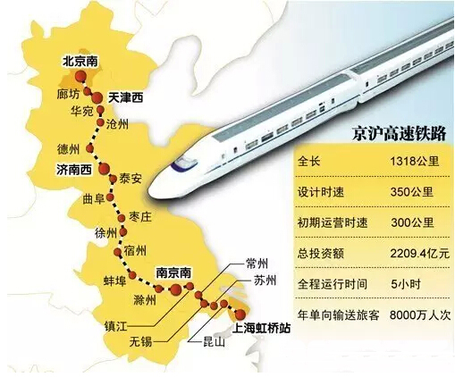 2011年6月,京沪高铁建成投产,这是世界上一次建成线路最长、标准最高的高速铁路。它贯穿北京、天津、河北、山东、安徽、江苏、上海7省市,连接环渤海和长三角两大经济区,全长1318公里。
