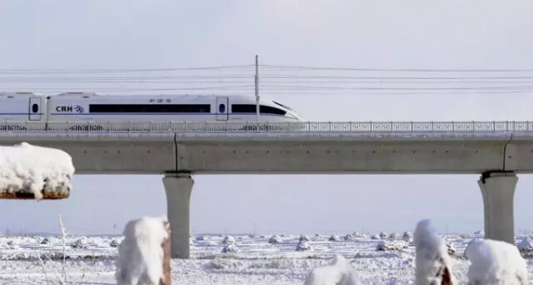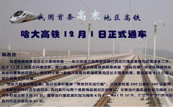 2012年12月1日,中国首条也是世界第一条新建高寒地区长大高速铁路哈尔滨——大连高铁投入运营。哈大高铁营业里程921公里,设计时速350公里,纵贯辽宁、吉林、黑龙江三省,全线设23个车站。根据最近30年的气象记录,东北三省全年温差达到80℃,是中国最为寒冷、也是温差最大的地区。中国高铁在这样冷的地方经受住了考验,赞!