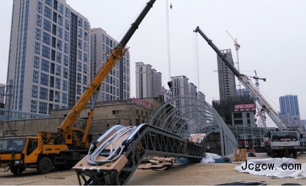 记者在现场看到,2台大型的吊车正在景观棚钢梁骨架上,利用窄狭的空间采用接续吊装的办法进行扶梯的吊装,每部扶梯重量大约在8吨左右,长度为16米。除了前几天吊装完6部扶梯以外,当天下午吊装了老站舍前地下工程西侧的两部扶梯,另外还有一部直立电梯也在安装调试中。