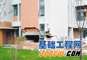 4号楼单元门前的一段墙体由于地面沉降发生坍塌