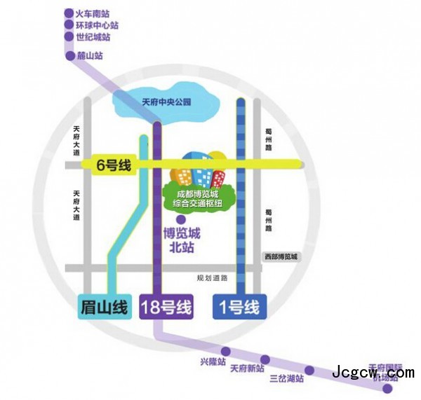 值得关注的是,在地铁18号线上,还有一座“巨无霸”站点——博览城综合交通枢纽,它是成都目前规划的最大轨道交通换乘枢纽,有4条轨道线在此交会。