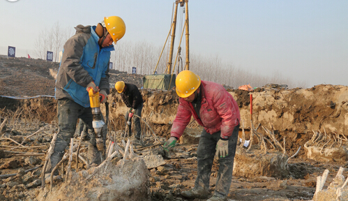 为全面推进小潮河闸拆建工程建设进度,加快省重点水利工程的建设步伐,灌南县水利部门积极组织项目单位采取科学规划、严格管理、增加机械、加班加点、挂图作战等方式,抓住冬季冰雪前的晴好天气,抢时间、赶工期、紧张施工。目前,组织150余名工人、8台钻机,昼夜施工,已经完成520根桩基的钻探任务,为春节前正身、翼墙底板浇筑奠定基础。图为工人用风镐破除桩头残余混凝土,做好浇筑准备工作。