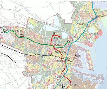 滨海新区规划B1、Z2和Z4三条地铁线示意图