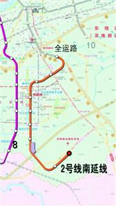 根据规划,2号线南延线工程将起于全运路站南端,沿机场高速与机场高速东侧规划道路之间的绿地敷设,下穿机场高速后右转入高深东路,于高深东路与智慧三街相交路口左转进入智慧三街,沿智慧三街道路中心线一直南下,至机场路后左拐沿机场路向东,至桃仙机场规划T3航站楼东侧设终点,线路全长约14.2km,设置8座车站,分别为桃仙大街站、高深东路站、全运三路站、市民广场站、科技园站、桃仙站、航站楼站、桃仙机场站。