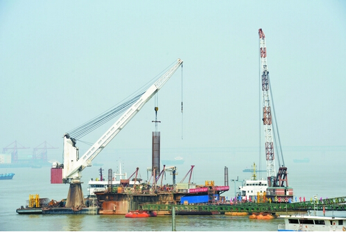 核心提示:截至目前,水上主桥3号墩预计4月中旬封底,主桥4号墩钻孔桩完成19根,主桥5号墩钻孔桩完成21根;全桥桩基完成413根,承台施工完成10个,大桥施工进度稳步推进