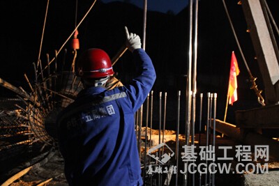 十五局一公司扎倒项目部夜间施工,现场技术员指挥吊装钢筋笼