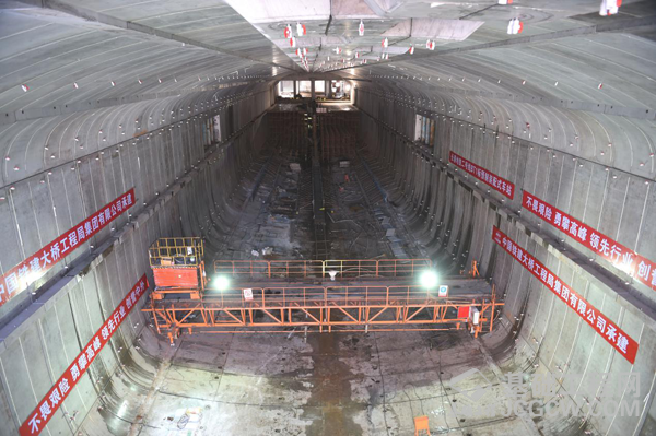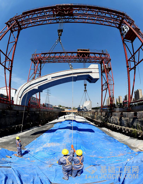 在袁家店车站预制混凝土构件拼装现场,龙门吊正在将重达55吨的构件,平稳顺畅地吊到安装位置,并通过精轧螺纹钢将每环七个构件牢牢地固定在一起,每一个构件内都设有球形阀门,这是用来注入环氧树脂对构件缝隙进行密封,同时,在每环顶板用非固化沥青、玻璃纤维布等材料进行防水处理,整个施工程序简洁清楚,施工现场干净利索。袁家店站设计拼装88环预制构件,目前,已拼装完成53环,已拼装部分的站体内已经开始进行中板支架摸板搭设,为现浇中板做准备。