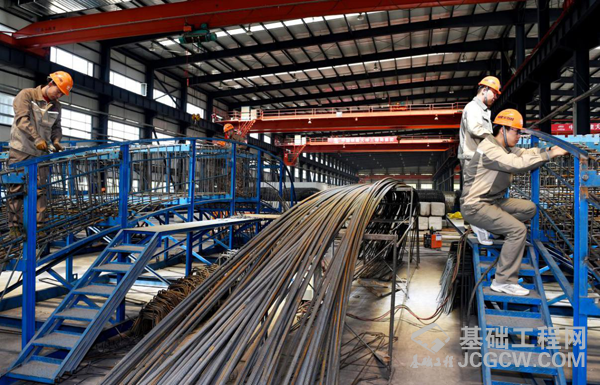 工人们在预制构件工厂紧张施工