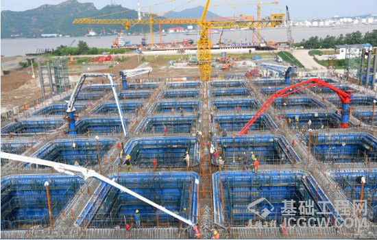 该沉井基础长100.7米、宽72.1米、高56米。为世界最大沉井,沉井采用矩形截面,标准壁厚2米,隔墙厚1.3米,中间共设置48个的矩形井孔。沉井共分10节,第1节为钢壳混凝土沉井,已浇筑完成。第2至第10 节为钢筋混凝土沉井,均为现场浇筑。本次混凝土接高为6米,混凝土浇筑必须分层、均匀、连续一次性浇筑,还要分层振捣,每层厚约30厘米,浇筑从沉井中间隔墙开始往四周对称分层浇筑。