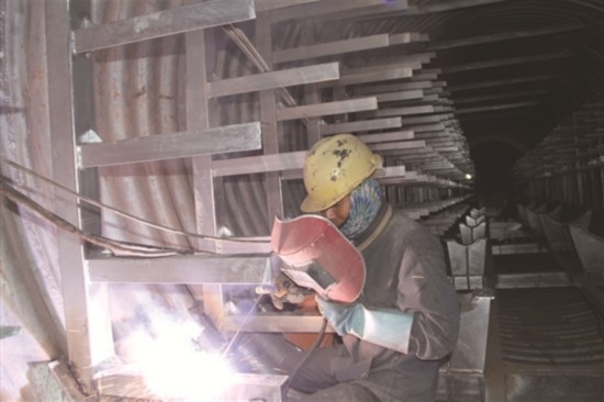 2014年,海东按照“先地下,后地上”的原则,率先在全省开工建设地下综合管廊工程。截至目前,已经完成综合管廊16.79公里,实现投资5.75亿元。图为工人在乐都区职教城波纹钢管地下综合管廊试验段中焊接电缆支架。