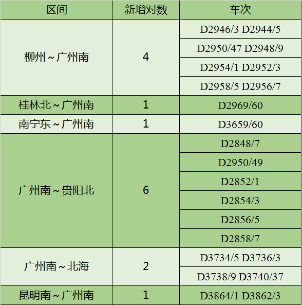 桂林北—南宁东D8217次运行区段调整为柳州—南宁东,车次改为D8257次;