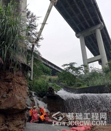 核心提示:高架桥受洪水冲刷桩基裸露 工人紧急加固