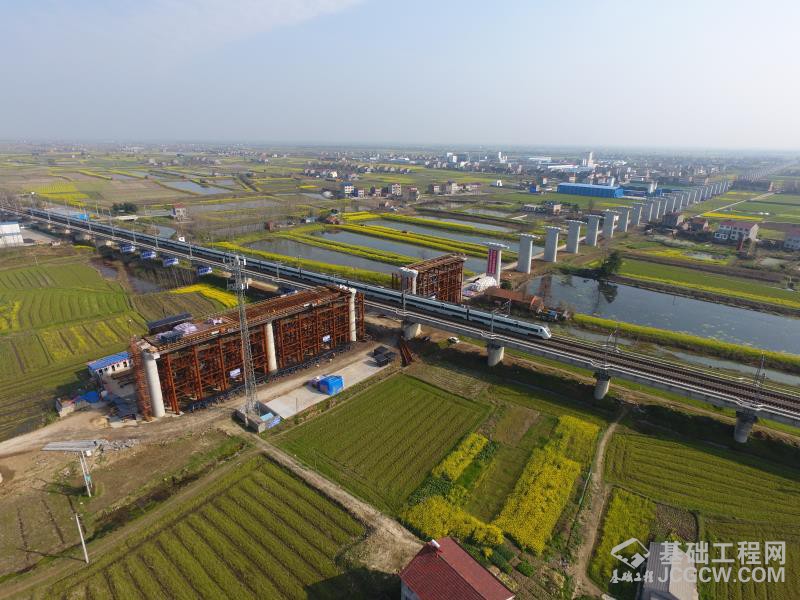 由中国铁建十四局集团承建的蒙华铁路跨汉宜高铁特大桥全长6584米,依次上跨长湖湿地保护区、汉宜高铁营业线、318国道和汉宜高速公路,是蒙华铁路湖北段重点控制性工程。桥梁跨越营运中的汉宜高铁,平均每5分钟就有一趟列车高速通过该区域。为确保安全,桥梁采用顶推法施工,施工人员预先浇筑一片长达45.7米的混凝土箱梁,再搭设滑道顶推到位。