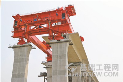 据介绍,三门湾大桥40米预制箱梁,顶板宽16.25米、底板宽7.65米、高2.6米,重量1263吨,采用两台均为650吨的轮轨式搬梁机运到提升站,并提升至运梁台车上,再由1300吨的运梁台车将其运到桥址,最后通过架桥机进行箱梁的架设。