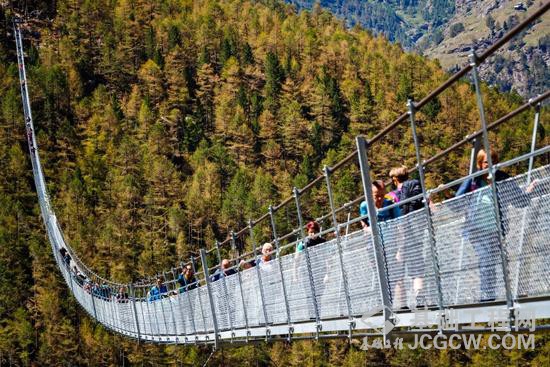 7月29日,在瑞士兰达,人们行走在“欧洲之桥”上。当日,世界最长的人行吊桥“欧洲之桥”正式竣工。这座吊桥全长494米,位于连接瑞士采尔马特和格拉申两个村庄的“欧洲小路”上方。