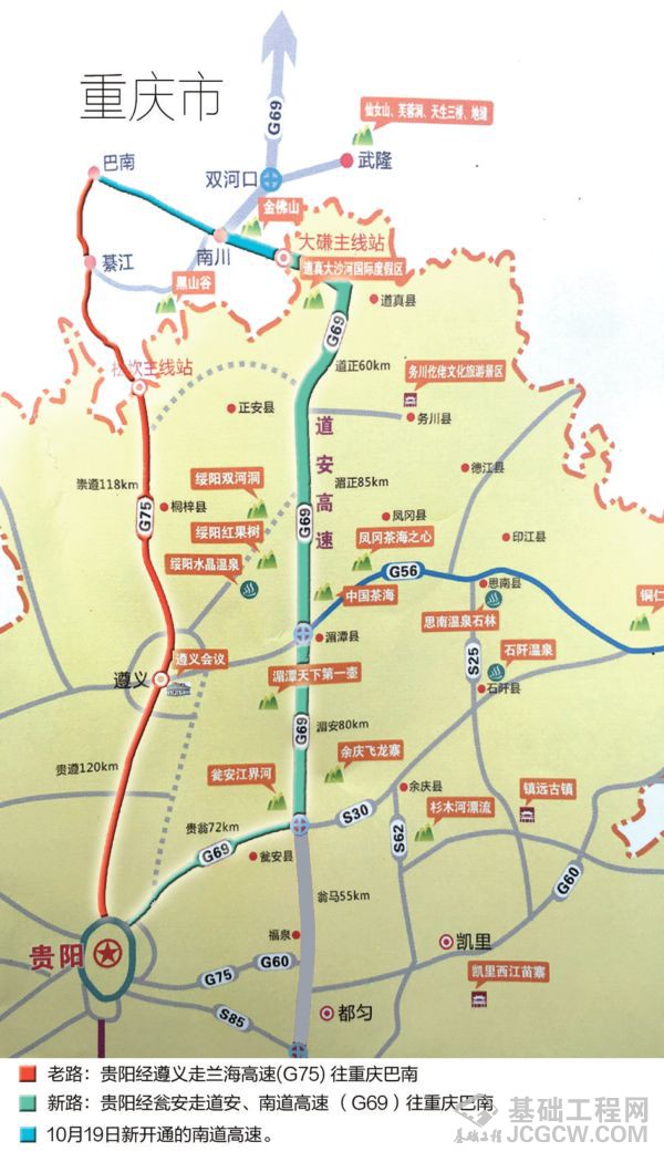 “将来铜仁、黔南、湄潭等地周边前往重庆的车辆,不用再绕行遵义,节约了不少路程和时间。”贵州中交道安公司有关负责人介绍,从贵阳前往重庆,走兰海高速经遵义到重庆巴南的线路,与贵阳走贵瓮、道安至重庆巴南,路程也相差不大,但道安高速为新开通路段,建设标准高,线型较好,全线限速110公里/小时,也将成为贵阳出发的部分司机选择直达重庆的新线路。