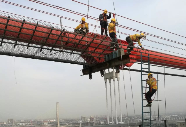索股牵引、吊索安装、箱梁吊装等重要作业,都是由施工人员在猫道上完成的。据了解,洞庭湖大桥的猫道最高点距离湖面200米高,全长约为2500米,所有的猫道面网均需施工人员手工拆除。