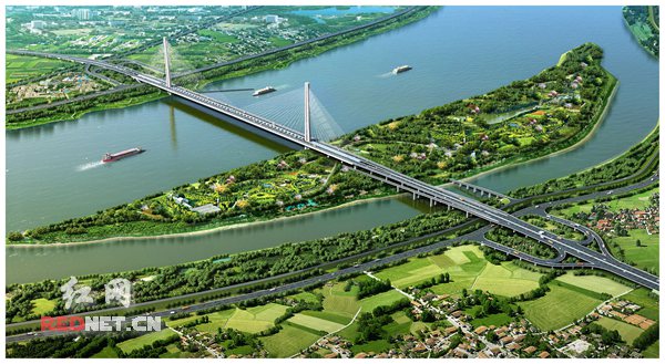 杨梅洲大桥及南北引线是连接岳塘区、雨湖区、西二环和湘潭县的主要通道,桥长约2400米,双向六车道。它北起西二环线,跨杨梅洲,其引线与岚园路延长线相接,南至建设路口。桥型选用“韶峰湘水”为主题的双塔斜拉桥,采用“一跨过江”的形式,其中桥主跨宽658米,为湘江上的大桥跨度之最。