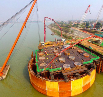 湘潭杨梅洲大桥主墩钢围堰封底混凝土开始浇筑