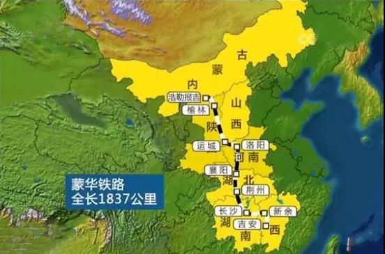 蒙华铁路全长1837公里,起点为内蒙古浩勒报吉,终点为江西吉安,纵贯蒙、陕、晋、豫、鄂、湘、赣七省区,年输送能力2亿吨以上,是世界上一次建成里程最长的重载铁路、中国规模最大的运煤专线。