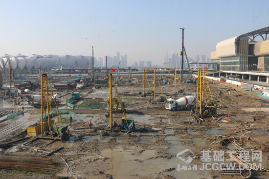 施工现场,多台打桩机、挖掘机分布在项目各个角落,在工人们的操作下开展桩基作业,场面热火朝天。据项目总经理马俊元介绍,因前期受G20峰会及重大会议展览活动等因素影响,目前工期吃紧。当前项目部已详细制定了施工节点计划,倒排工期、倒逼进度,将于桩基工程完成后马不停蹄地开展支护工程,确保项目如期竣工。