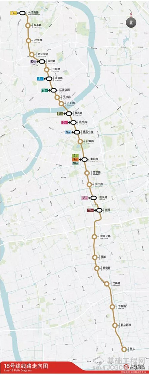 轨道18号线工程线路全长约36.8公里,始于宝山区长江南路站,经由长江南路—何家湾路—国权北路—国权路—江浦路—民生路—世纪公园—白杨路—莲溪路—御青路—沪南公路,终于浦东新区的航头镇,共设车站26座,全部为地下线,是条横贯宝山、杨浦、浦东三区的居住密集区的线路。