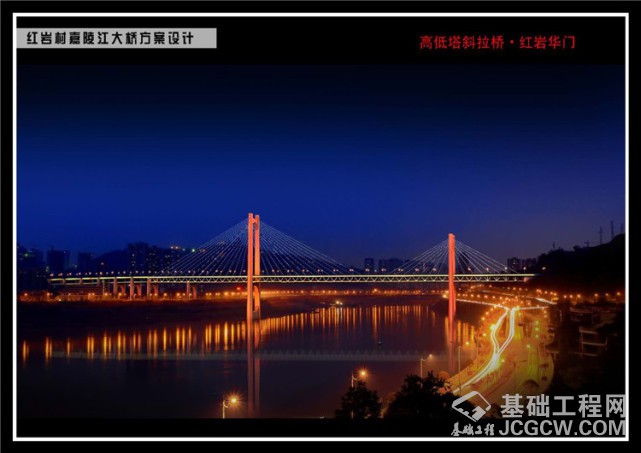 红岩村嘉陵江大桥位于嘉华大桥和石门大桥之间,南桥头位于渝中区红岩村附近、北桥头在江北区大石坝附近,桥长732.8米,同时承担着轨道交通5号线的过江任务。设计为“城市支路+双线轨道”模式,上层桥面为双向6车道公路,主要连接北环和陈庹路;下层桥面中间是轨道交通5号线双向轨道,两侧则为双向4车道的慢行汽车道,主要连接沙滨路和北滨路。