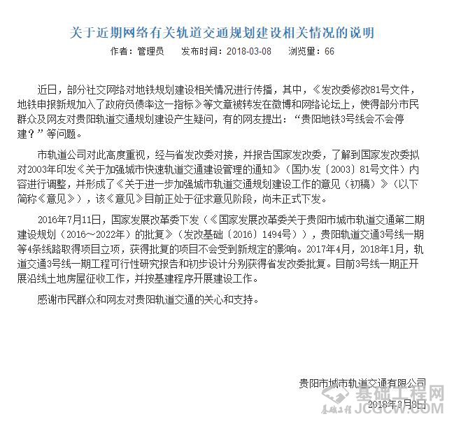 此外,2016年7月11日,国家发展改革委下发(《国家发展改革委关于贵阳市城市轨道交通第二期建设规划(2016~2022年)的批复》,贵阳轨道交通3号线一期等4条线路取得项目立项,获得批复的项目不会受到新规定的影响。去年4月和今年1月,轨道交通3号线一期工程可行性研究报告和初步设计分别获得贵州省发改委批复。目前3号线一期正开展沿线土地房屋征收工作,并按基建程序开展建设工作。