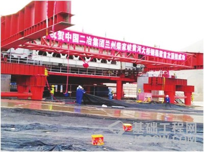 西固柴家峡联络线黄河大桥工程钢箱梁首次顶推成功