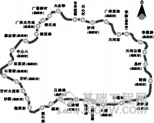 概况:全长约44.2公里,全部采用地下敷设方式。全线共设车站32座,其中换乘站19座。全线采用8节A型车编组。是广州地铁首条环线。图中站名均为暂定名。