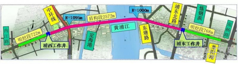 周家嘴路越江隧道新建工程起于浦西周家嘴路——内江路交叉口,沿周家嘴路向东连续下穿军工路中环线、上海理工大学、复兴岛、黄浦江及东运船舶有限公司后,在浦东莱阳路东西两侧先后接地,接入东靖路,终于张杨北路交叉口。