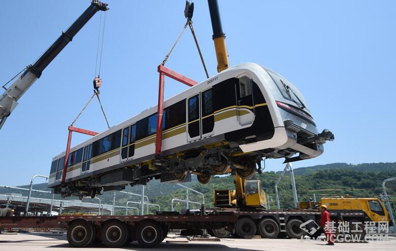4月18日,重庆唐家沱轨道交通车辆段工作人员起吊用于重庆轨道交通环线运营的地铁车辆。