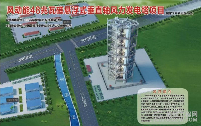 项目概况:项目主体高度196米,采用巨型钢桁架结构,单塔年发电量约为2.2亿千瓦时,用钢量约1万吨。共设置六层磁悬浮式水平叶片,每层叶片依靠磁悬浮与风共同作用进行旋转,独立发电且互不影响,便于安装与维护,具有无噪音、无污染、无排放、无辐射等优点。该项目是国家发改委、国家能源局、山东省发改委立项核准的重大能源建设项目,是目前全球单体最高、发电量最大的风力发电塔项目。