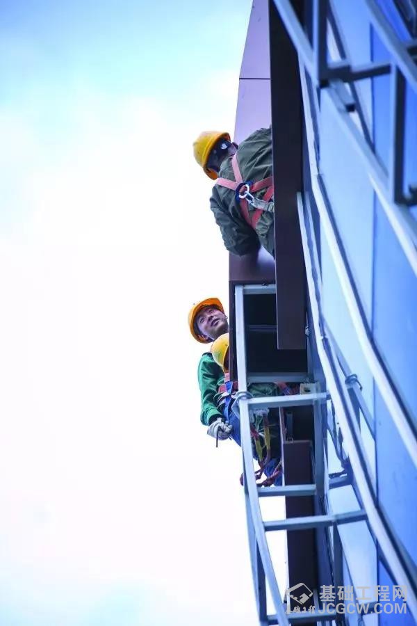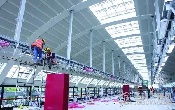 施工人员在雅关站安装站房玻璃幕墙