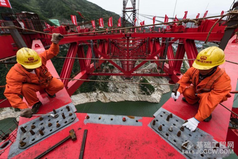 5月22日,世界最大跨度钢箱桁架推力式拱桥——香溪长江大桥主拱成功合龙。该桥是三峡后续规划项目,位于三峡库区湖北省秭归县境内,桥身全长883.2米,主跨531.2米,为一跨过江、双向四车道公路桥。项目建成后将打通沪蓉、沪渝高速,串起三峡、神农架、武当山三大世界级景点,打破秭归县长江两岸以汽渡为唯一通道的交通现状。图为施工人员正在对主拱合龙段工具螺栓实施紧固