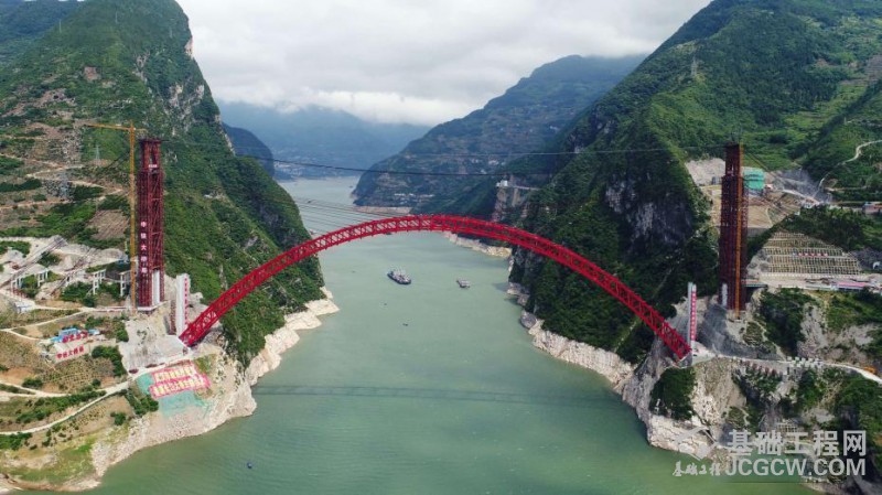 5月22日,世界最大跨度钢箱桁架推力式拱桥——香溪长江大桥主拱成功合龙。该桥是三峡后续规划项目,位于三峡库区湖北省秭归县境内,桥身全长883.2米,主跨531.2米,为一跨过江、双向四车道公路桥。项目建成后将打通沪蓉、沪渝高速,串起三峡、神农架、武当山三大世界级景点,打破秭归县长江两岸以汽渡为唯一通道的交通现状。图为香溪长江大桥红色桥拱飞跨兵书宝剑峡。