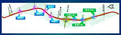 (1)1全线取消红绿灯,新增4处过街通道,全线过街设施达11处 道路总体采用主线节点下穿的方案,在草场门大街、清凉门大街、汉中门大街和水西门大街交叉口设置4座节点隧道。