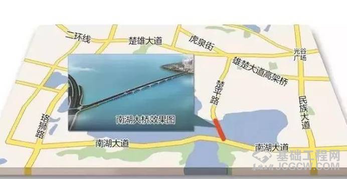 南湖大道与雄楚大道间的南湖区域,南北方向仅有珞狮路和民族大道两条主干道,其交通较为拥堵。2013年,楚平路(雄楚大道—南湖大道)工程正式开工,全长约2.557公里,除了道路工程外,最为关键的是南湖大桥。