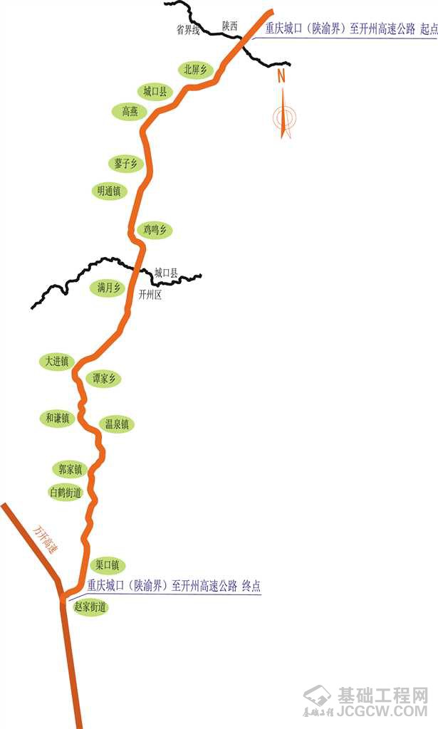 据城开高速建设业主——重庆高速工程顾问有限公司介绍,城开高速北接拟建的陕西安康至岚皋高速公路,为国家高速公路G69银(宁夏银川)百(广西百色)高速的一段。城开高速起于大巴山陕渝界(设纵贯陕渝的大巴山隧道),经城口县北屏、县城、蓼子、鸡鸣,穿雪宝山(设城开隧道),再经开州区满月、大进、温泉、白鹤、渠口,接万(州)开(州)高速公路。