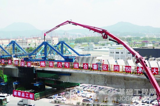 该150m大跨桥位于6号线一期工程第16个区间,结构形式为四墩三跨,全长330 .122(90 .331m + 150m +89 .791m ),线路平面位于半径为550m的曲线上,它是目前为止国内地铁领域最大跨度的V形刚构连续梁拱桥,由深圳地铁集团建设、中铁南方总承包、中铁北京工程局负责施工。