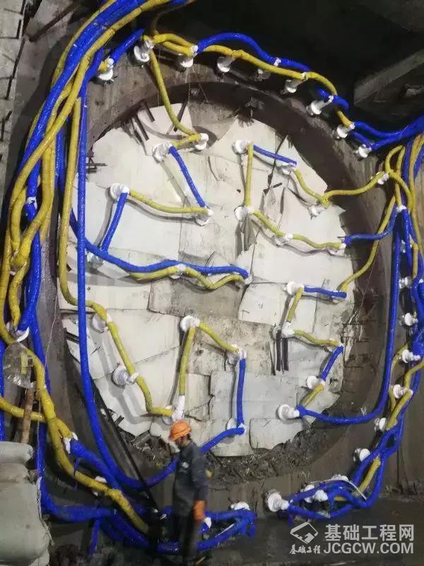 为保证洞口接收时周围土体不渗水,在盾构推进至洞门前,技术人员提前通过埋设冷凝管,对周围土体进行冷冻,将洞口前泥土温度降至零下10度以下,“这样,泥土里的水分都被冻成了冰,保证不渗水。