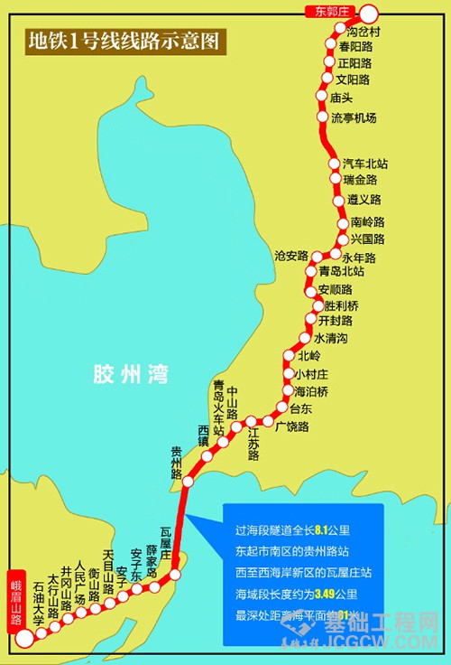 地铁1号线过海段隧道全长8.1公里,东起市南区的贵州路站,穿过胶州湾湾口海域,与西海岸新区的瓦屋庄站相连接。其中,海域段长度约为3.49公里,最深的地方,距离海平面约81米。