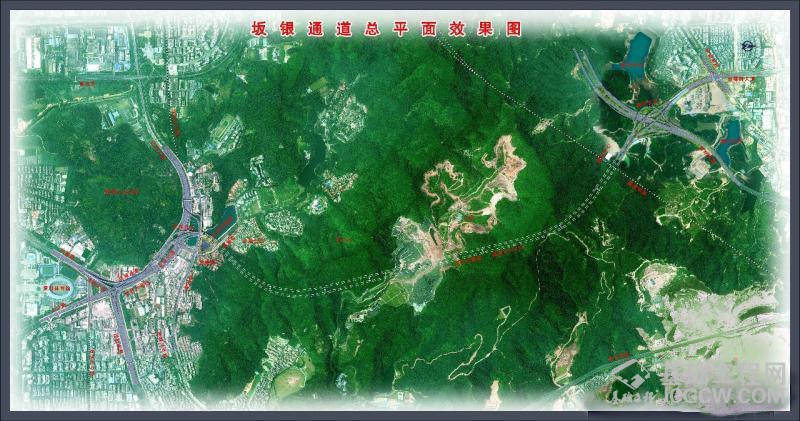 坂银通道工程南起黄木岗立交北侧,向北经泥岗立交沿北环大道西侧高架布置。它上跨北环大道后以下沉隧道方式穿越金湖调蓄湖水库,继续下穿银湖路进入鸡公山,下穿下坪垃圾填埋场后上跨厦深铁路梅林隧道,出隧道后上跨南坪快速,向北接坂雪岗大道,终至环城南路路口,主线全长7.643公里。全线新建鸡公山隧道1座(左右线总长8856米)和互通式北环立交,改造泥岗北环、南坪坂雪岗两座互通式立交。主线设计标准为城市一级主干道,双向6车道,规划红线宽度60~150米,设计车速50Km/h。
