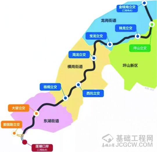 本工程沿线与水官高速公路、龙岗大道(G205国道)、沙荷路、东部过境高速公路、锦龙路(坪盐通道)、坪西公路、绿梓大道、外环高速公路等规划或者现状道路相交,全线共设置15座互通立交。