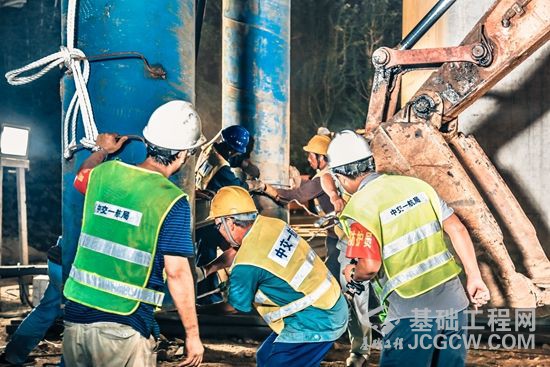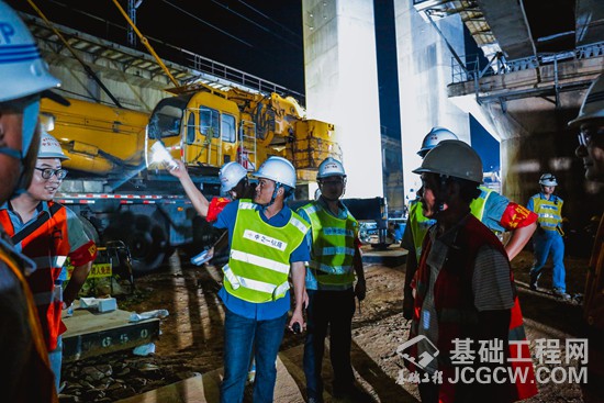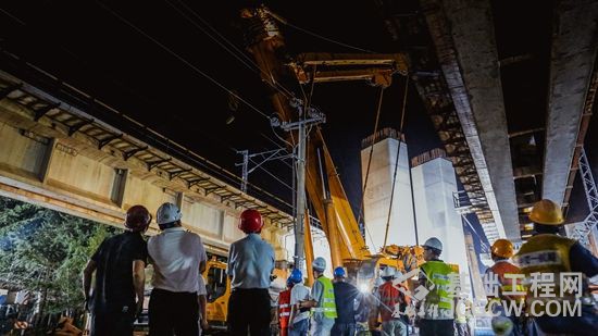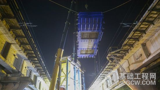 “小心……”“这边点!”工人们正在按照分工按部就班紧张忙碌,准备着吊装、钢筋、搭建等工作,一切都进行的井井有条。凌晨两点四十左右,施工进入紧张的安装帽梁的小高峰,30多吨的帽梁钢筋笼整体吊装,必须分毫无误地架到27号墩上,而28号墩由于左右两侧均临近营业线,所以必须整体吊装60多吨重的帽梁。“本次施工吊装体量大,距离营业线近,作业时间仅有300分钟,施工规模大,是鲁南高铁最难的一处节点,今天能把它攻破,也为以后的营业线施工积累了宝贵的经验。”中交一航局鲁南高铁项目副经理贾兴告诉记者。