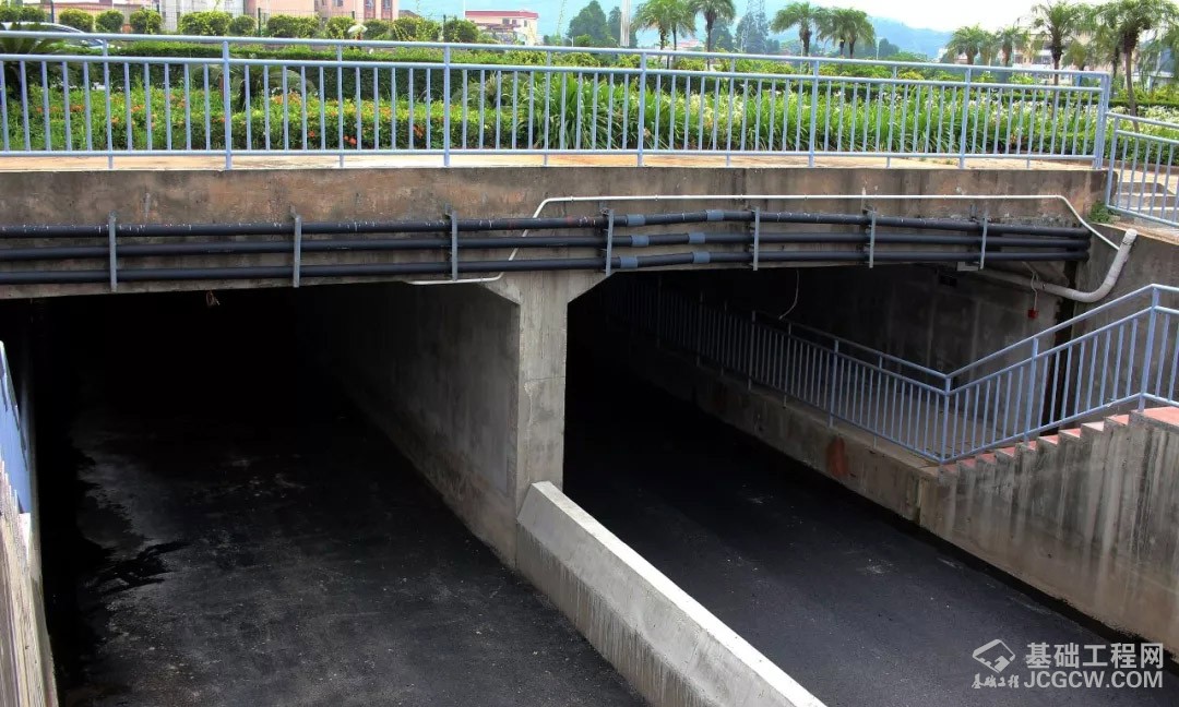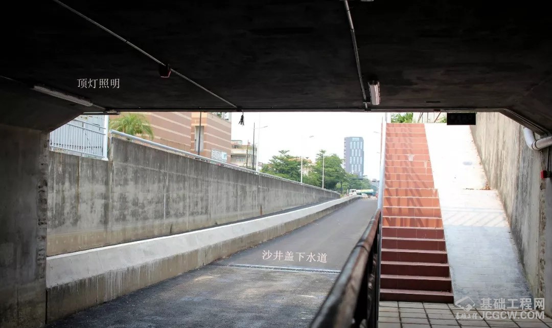 现场南北出入口都有沙井盖顶的下水道,而隧道内部暂时没发现。从周边建设情况分析,如果下雨,东西两侧因有隔离带,雨水不会流入;那么水源就只有两边出入口南北倾注,以及从天而降的雨水,一般雨量,并且下水道畅通,没有堵塞的情况下(安全情况下,做好隧道保洁工作,防止沙井垃圾杂物泥沙淤积),排水无问题。